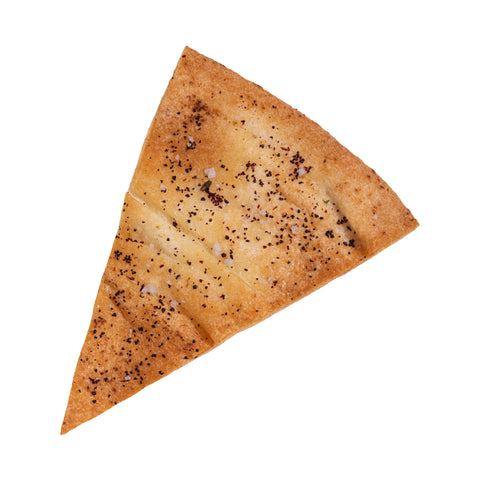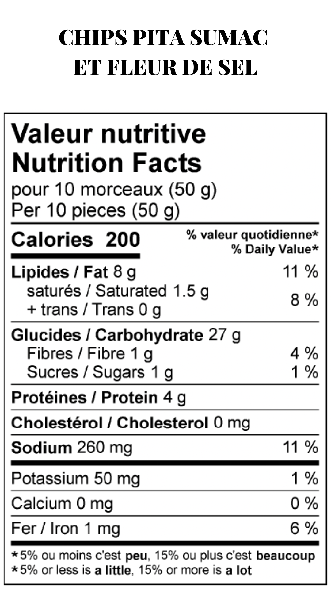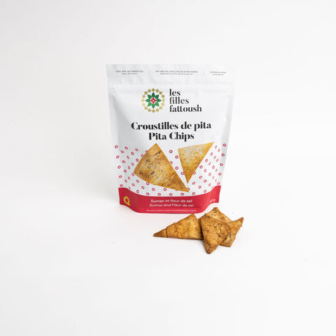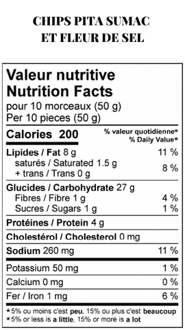 Ingrédients : Pain pita (Farine non blanchie non traitée, Eau, Levure, Sucre, Sel, Vinaigre, Propionate de calcium, L-cysteine), Huile d’olive, Huile de canola, Sumac (Sumac, Sel, Acide citrique), Fleur de sel.